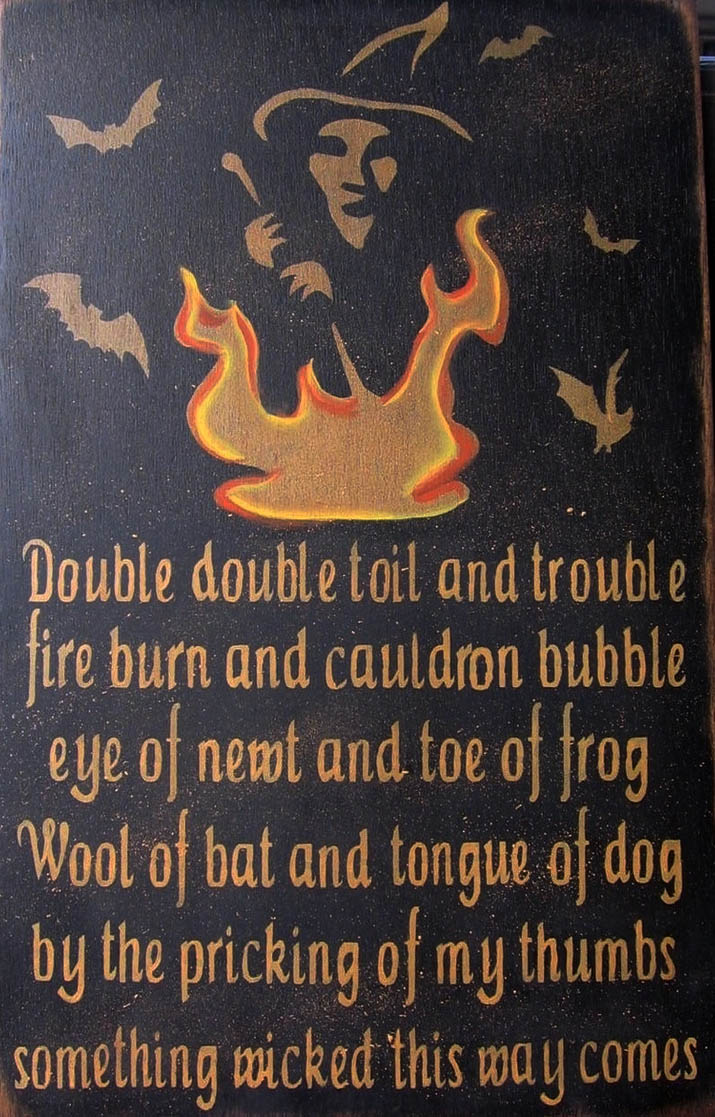Thrice the brinded cat had mew'd. Thrice and once the hedge-pig whined. Harpier cries 'Tis time, 'tis time. Double, double toil and trouble Fire burn and cauldron bubble. Round about the cauldron go; In the poison'd entrails throw. Toad, that under cold stone Days and nights has thirty-one Swelter'd venom sleeping got, Boil thou first i' the charmed pot. Double, double toil and trouble; Fire burn, and cauldron bubble. Fillet of a fenny snake, In the cauldron boil and bake; Eye of newt and toe of frog, Wool of bat and tongue of dog, Adder's fork and blind-worm's sting, Lizard's leg and owlet's wing, For a charm of powerful trouble, Like a hell-broth boil and bubble. Double, double toil and trouble; Fire burn and cauldron bubble. Scale of dragon, tooth of wolf, Witches' mummy, maw and gulf Of the ravin'd salt-sea shark, Root of hemlock digg'd in dark, Liver of blaspheming Jew, Gall of goat, and slips of yew Sliver'd in the moon's eclipse, Nose of Turk and Tartar's lips, Finger of birth-strangled babe Ditch-deliver'd by a drab, Make the gruel thick and slab: Add thereto a tiger's chaudron, For ingredients for our cauldron. Double, double toil and trouble; Fire burn and cauldron bubble. By the pricking of my thumbs, Something wicked this way comes. Open, locks, Whoever knocks!